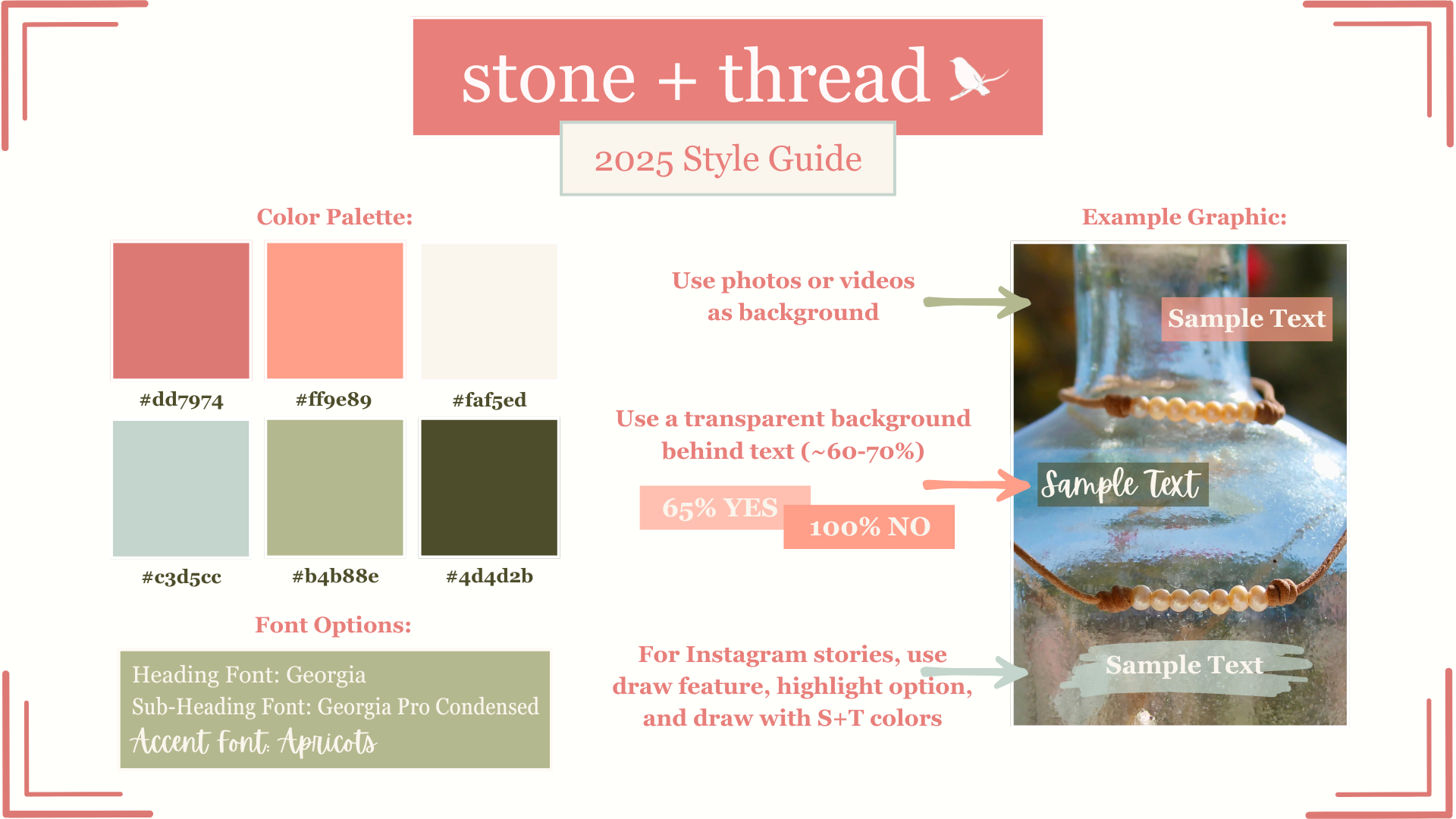 This included color palette, typography, logo usage, and overall design direction, along with guidance on post styling, layout, and tone. The goal was to ensure all content remains consistent, visually cohesive, and aligned with the brand’s coastal, modern, and handcrafted aesthetic.